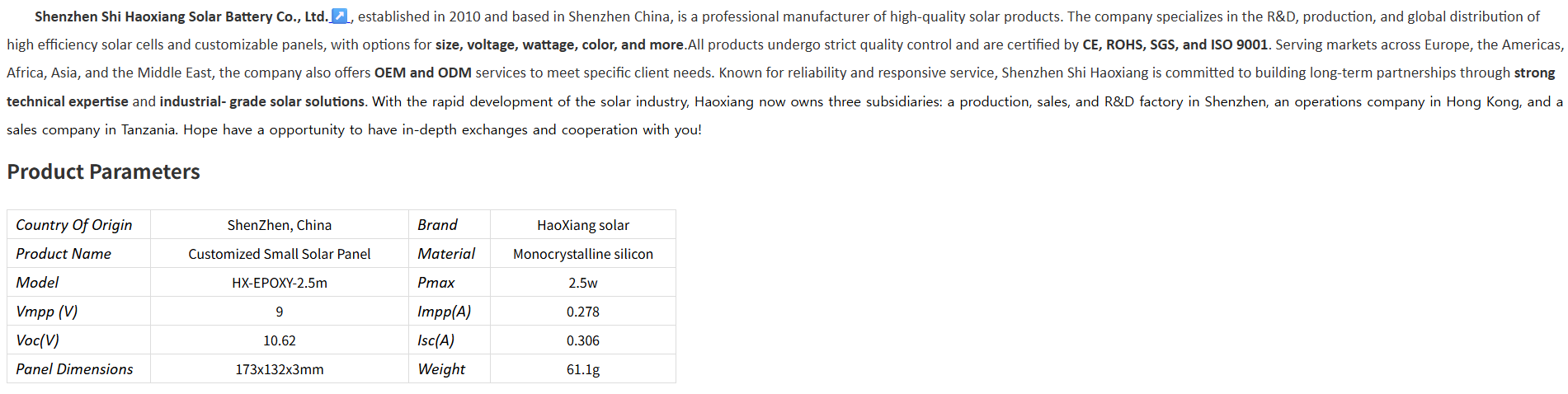 HX 2.5W SV series small solar panel features a compact 173x132mm size and high-efficiency mono cells with robust epoxy resin encapsulation ensuring long-term weather resistance and reliability.